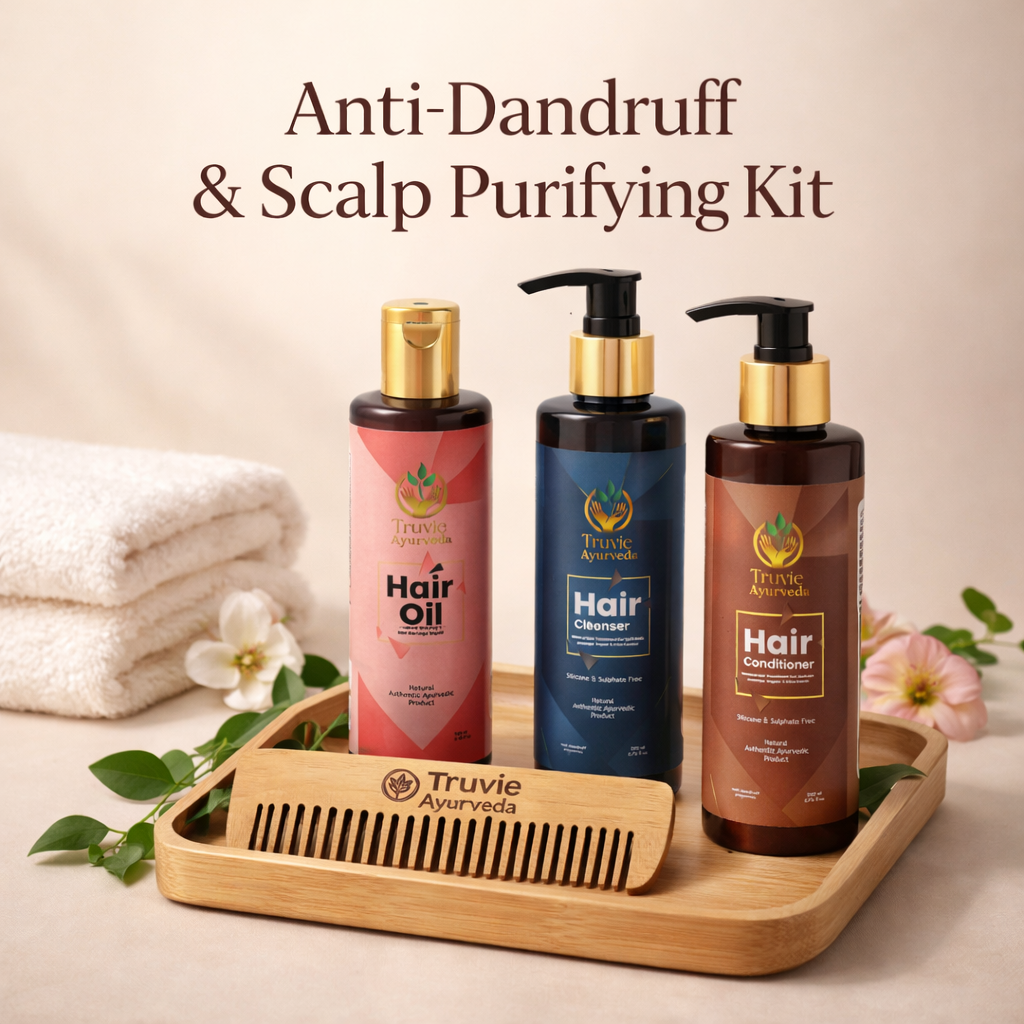 The Anti-Dandruff & Scalp Purifying Kit focuses on cleansing and purifying the scalp environment. This Ayurvedic scalp-care helps remove buildup, calm irritation, and restore scalp balance, creating the right foundation for healthy hair growth.